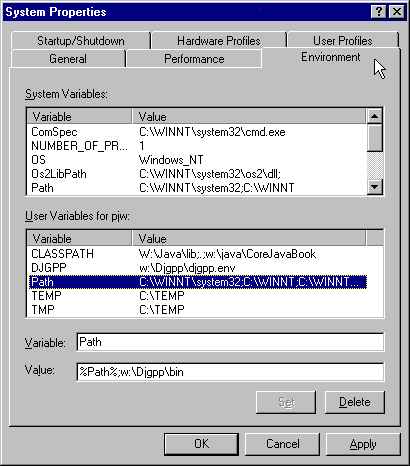 following:-%Path%;w:\Djgpp\bin;w:\Djgpp\bin to the end (do not